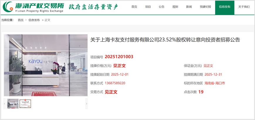 近日,海航商业控股发布公告,拟对外转让上海卡友支付服务有限公司23.52%股权,并于2025年12月1日至12月31日面向市场公开征集意向投资者。
